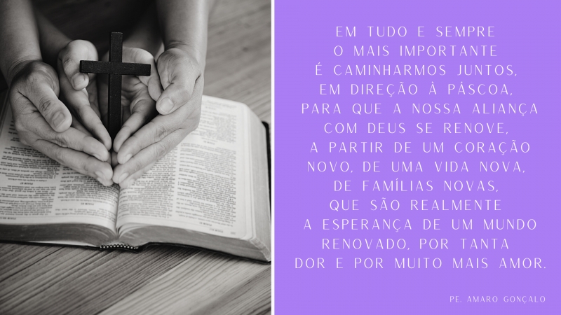 4. Assumir o programa quaresmal diocesano “Todos juntos na arca da Aliança” significa que, neste caminho, vamos todos juntos, pais e filhos, crianças e jovens, adultos e idosos, em família e em comunhão com a Igreja, como nos convocava o profeta Joel: “Congregai os anciãos, reuni os jovens e as crianças. Saia o esposo do seu aposento e a esposa do seu tálamo.Chorem os sacerdotes, ministros do Senhor”. Para isso, criemos em cada casa um cantinho de oração, para rezar e celebrar uma Liturgia Familiar, em que tenhamos oportunidade de redescobrir os tesouros de casa. Esta liturgia ajudar-nos-á a partilhar experiências de tudo quanto Deus fez por cada um, pela família, na alegria e na tristeza, na saúde e na doença, nos fracassos e sucessos, nas ofensas e perdão, nas crises e na sua superação, na rotina e nas surpresas de cada dia. Uma família que reza e faz memória agradecida, transmite a fé, não por ensinar o catecismo, mas por testemunhar e contagiar a graça de Deus, como pão de cada dia.