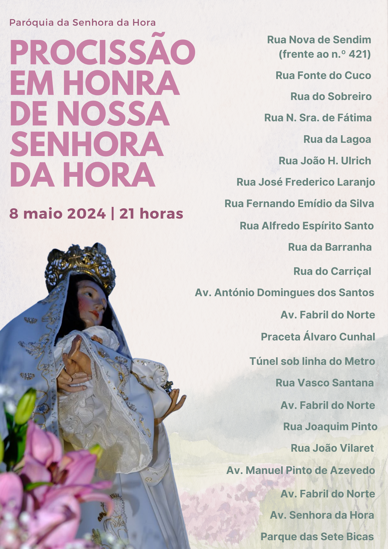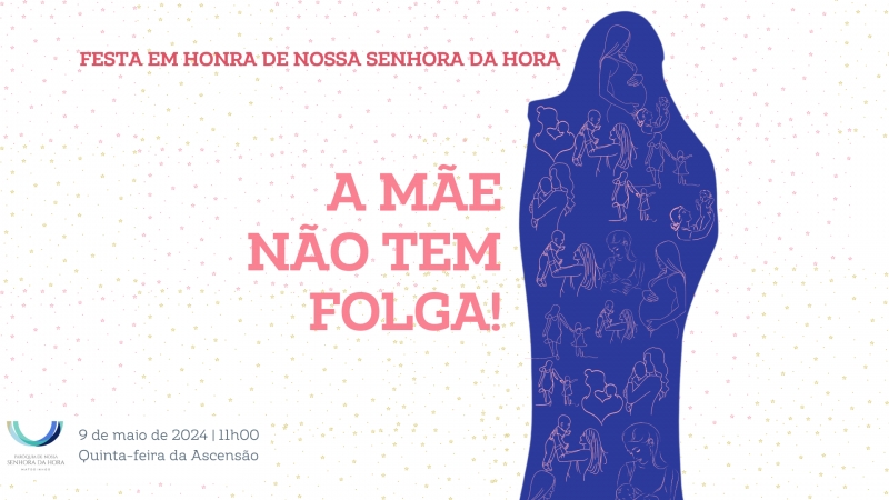 6. Irmãos e irmãs: em Maria, Nossa Senhora da Hora, Mãe de Jesus e nossa Mãe, Deus assinou o seu “autógrafo” (Papa Francisco, Homilia, 1.1.2018), deixou a Sua marca de amor eterno. Peçamos a Nossa Senhora da Hora, a Maria, nossa Mãe, que leve a Paz e a alegria de Seu Filho a todas as mulheres grávidas, a todas as Mães deste mundo, sobretudo àquelas para quem a maternidade representa uma heroica exigência. À volta de Maria, como filhos seus, tomemos maior consciência de que somos irmãos, chamados a construir um mundo de Paz. Tenhamos confiança na Senhora da Hora, em todas as horas, porque uma Mãe não tem horas.  “A Mãezinha não tem folga” (Spot publicitário da Rádio Comercial, Dia da Mãe 2024). A Mãe está lá e estará sempre: lá onde estiverem os seus filhos, lá onde o seu cuidado for mais urgente e necessário, lá onde ninguém sabe, onde ninguém vê, onde ninguém aplaude.