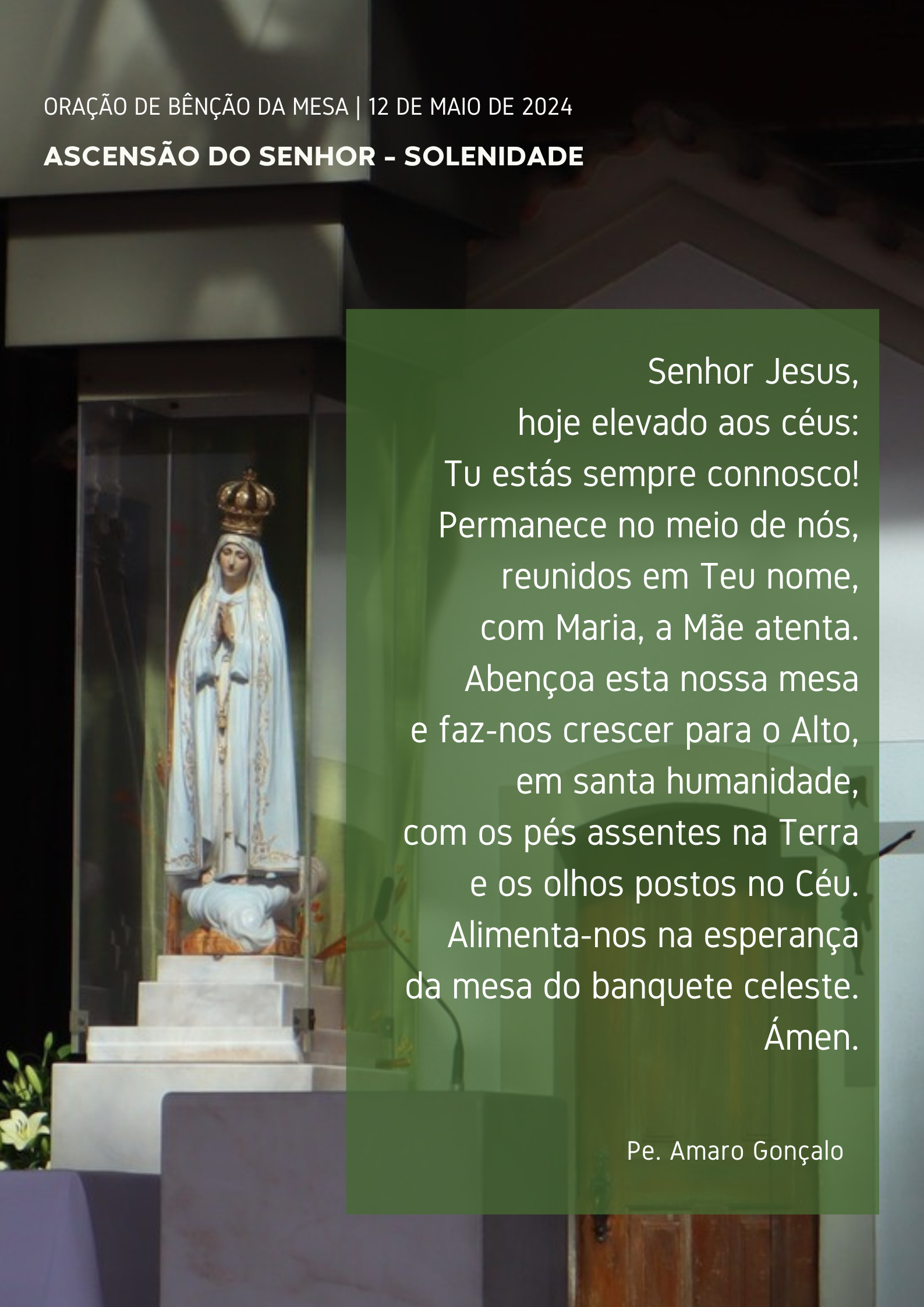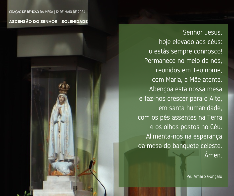 Da Páscoa à Ascensão quarenta dias vão. E hoje, em vez de lágrimas na partida e na despedida de Jesus, fazemos Festa. Porque Ele parte para ficar e nós ficamos para partir em missão. Agora o desafio é o de crescermos em humanidade e santidade, para aparecermos e testemunharmos, sem medo, a presença de Cristo em todos os ambientes da nossa vida. Nestes dias, entre a Ascensão e o Pentecostes, não estamos órfãos, porque o Espírito Santo nos assiste e porque Maria está connosco, como esteve com a Igreja nascente. Pelas vezes, em que usurpamos o lugar de Jesus, substituindo em vez de O fazer presente, ou calando-O, por vergonha, em vez de O anunciarmos, com alegria, invoquemos a misericórdia do Senhor.