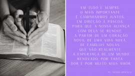 Todos juntos na arca da Aliança”!  Este é o propósito que nos guia, neste caminho da Quaresma à Pascoa de 2021. Deus chama-nos a viver em aliança com Ele!  Esta vida em aliança começa no nosso Batismo, cujas promessas renovaremos na Páscoa do Senhor. Esta aliança vive-se, de modo especialmente belo, na alegria do amor conjugal e familiar. E, por isso, a nossa caminhada para a Páscoa, em tempos de pandemia e de confinamento, é eminentemente familiar. Irmãos e irmãs: reunimo-nos, hoje, para dar início a este percurso, que nos levará à Páscoa da nova aliança: aliança irrevogável da parte de Deus, sempre fiel ao Seu Amor; aliança, da nossa parte, muitas vezes ferida pelas nossas infidelidades. Aproveitemos então a graça deste tempo da Quaresma, não para maldizer a quarentena que dura há quase um ano, mas para renovar a nossa fé, a nossa esperança e a nossa caridade. Este é o tempo favorável para nos convertermos e voltarmos ao primeiro amor, numa vida em aliança com o Senhor. Desde este primeiro dia da Quaresma, peçamos ao Senhor esta grande graça.