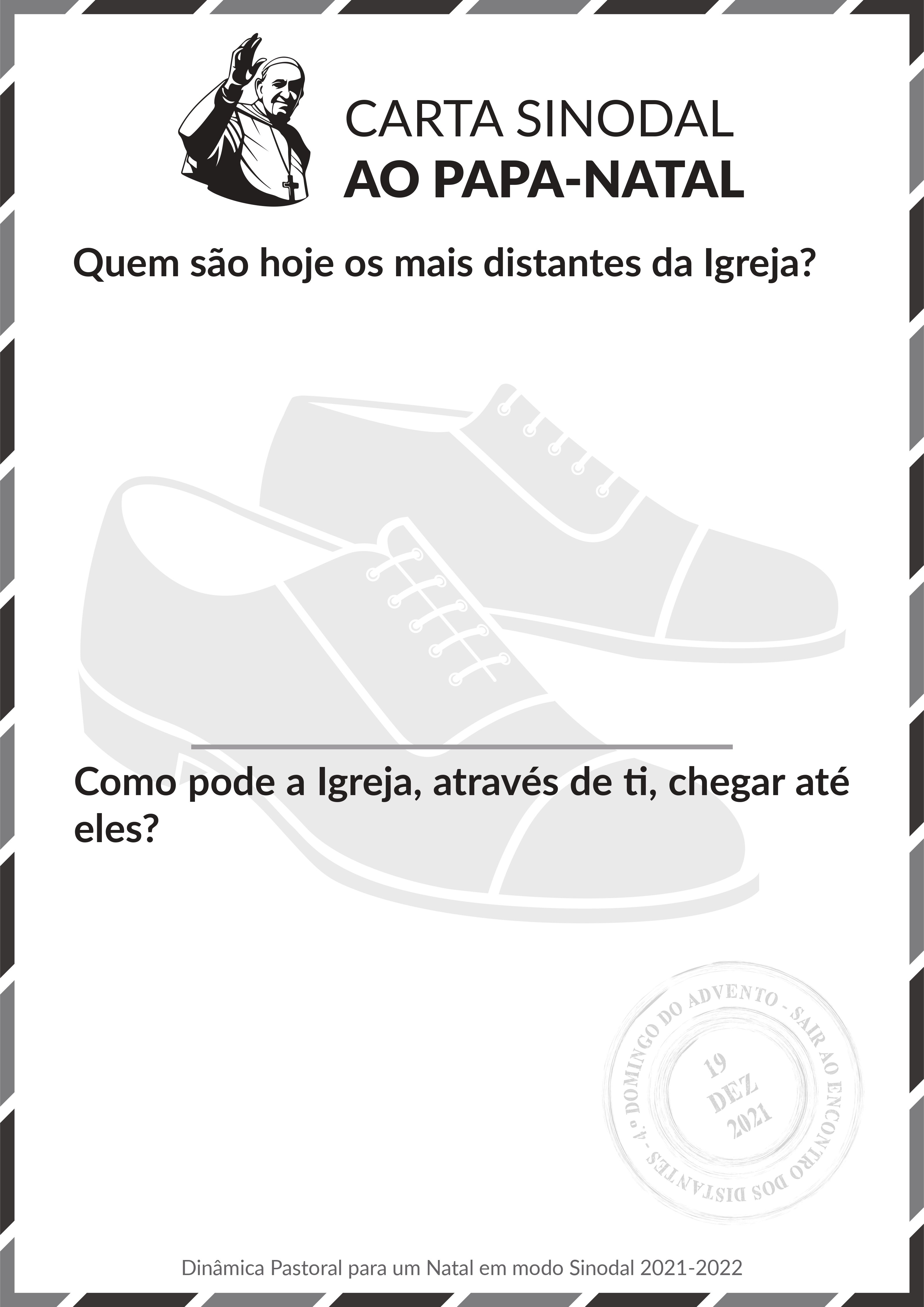 3. Irmãos e irmãs: revisitemos o nosso plano de visitas e de viagens, para os próximos dias natalícios. Cada um deixe ressoar dentro de si estas perguntas, para rescrever as respostas no seu Bilhete-postal à Família Natal: “Quem vais visitar neste Natal? Quais são os mais distantes de quem precisas de te aproximar”? Em processo sinodal, interroga-te e responde na tua Carta Sinodal ao Papa Natal: “Quem são hoje os mais distantes da Igreja? Como pode a Igreja, através de ti, chegar até eles”?