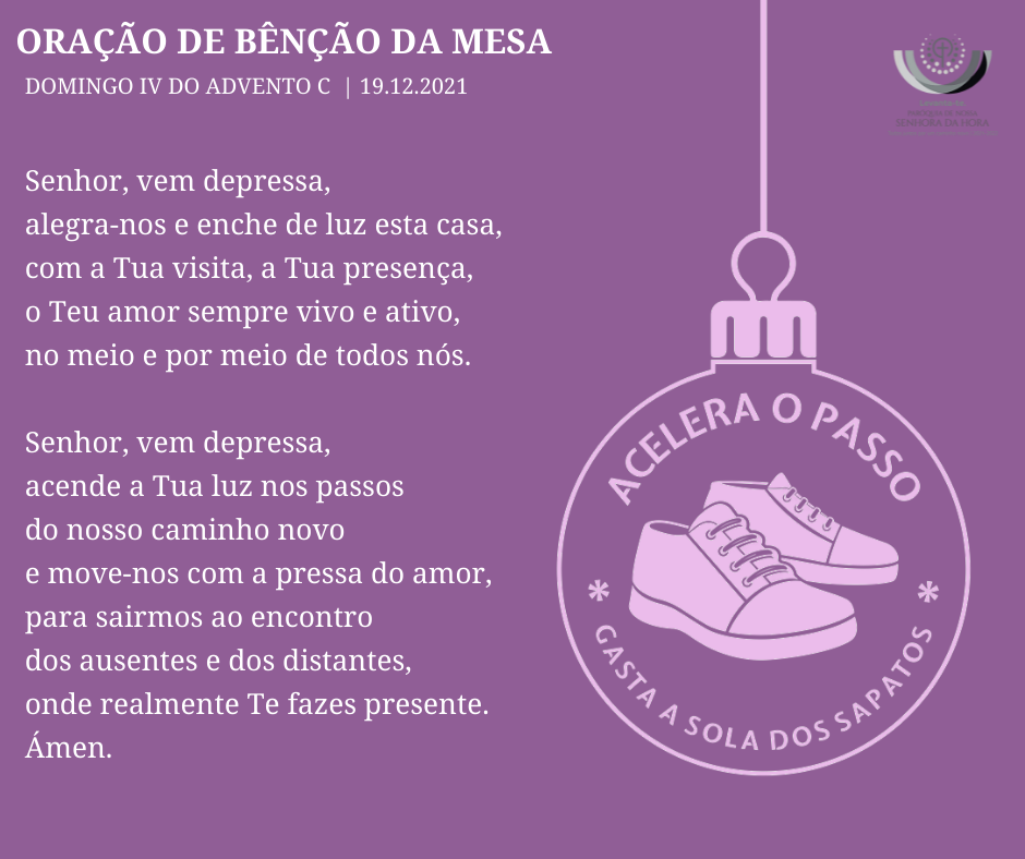 Pés ao caminho. Juntos pelo Natal. Este é o lema da nossa dinâmica pastoral, para um Natal em modo sinodal. Para esta última semana do Advento, às portas do Natal, o desafio é este: Acelera o passo! Gasta a sola dos sapatos. Deixemo-nos mover pelo exemplo de Maria: depois do seu “sim”, que dá origem à estação e à gestação do Natal,Maria percorre 120 km de Nazaré à Judeia, atravessando montanhas,ao encontro da sua prima Isabel. É um caminho de gestação e de esperança, pois leva no seu seio o Menino Deus, que Se faz Homem. É um caminho íngreme, desconhecido, mas que Ela percorre com audácia e coragem criativa, pois também nas asperezas do caminho crescem flores brancas de esperança. Com o seu exemplo, a Virgem Maria incita-nos a sairmos de casa, da nossa zona de conforto, para levarmos às periferias do nosso mundo, aos mais sós e distantes, a presença do Senhor.