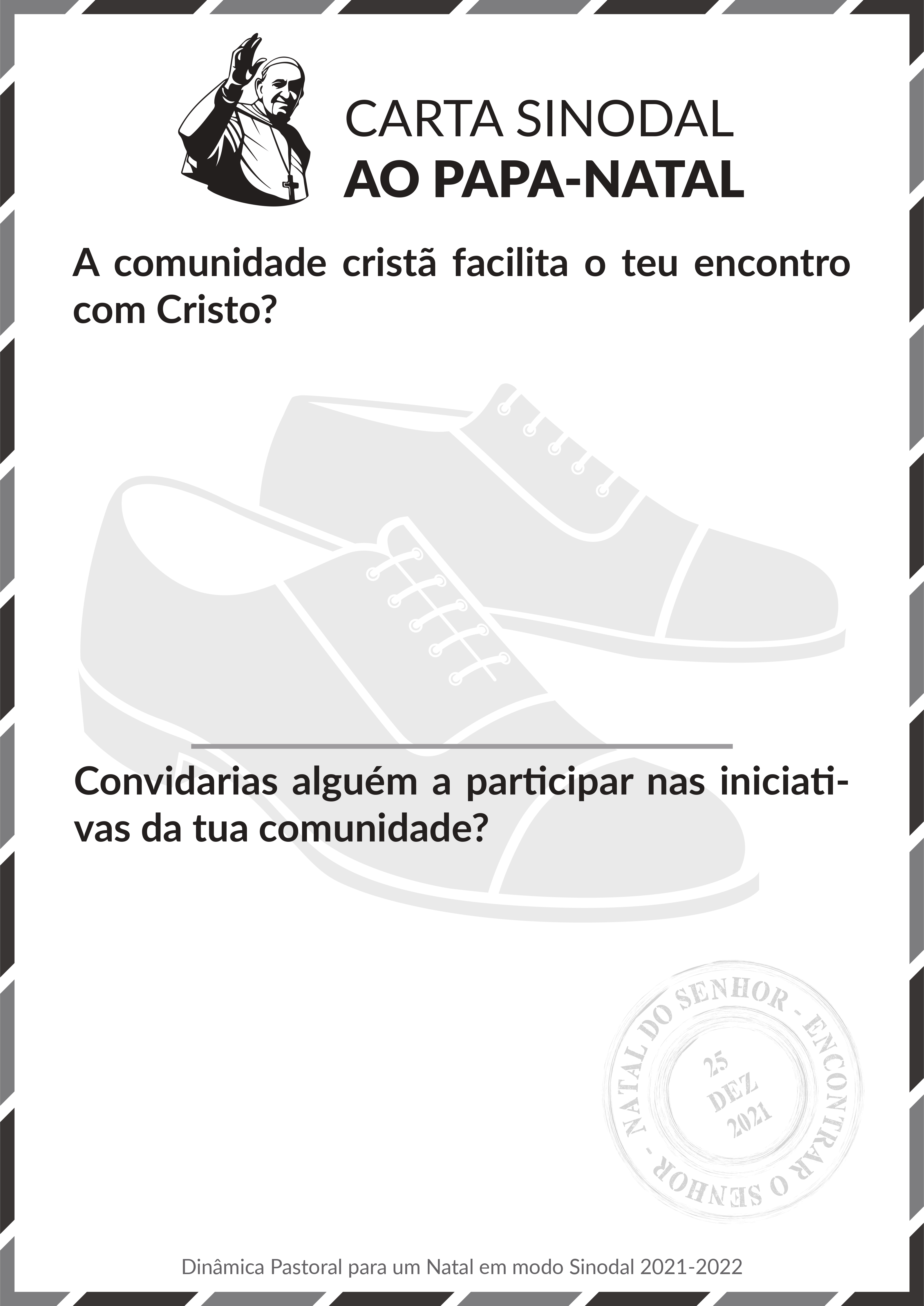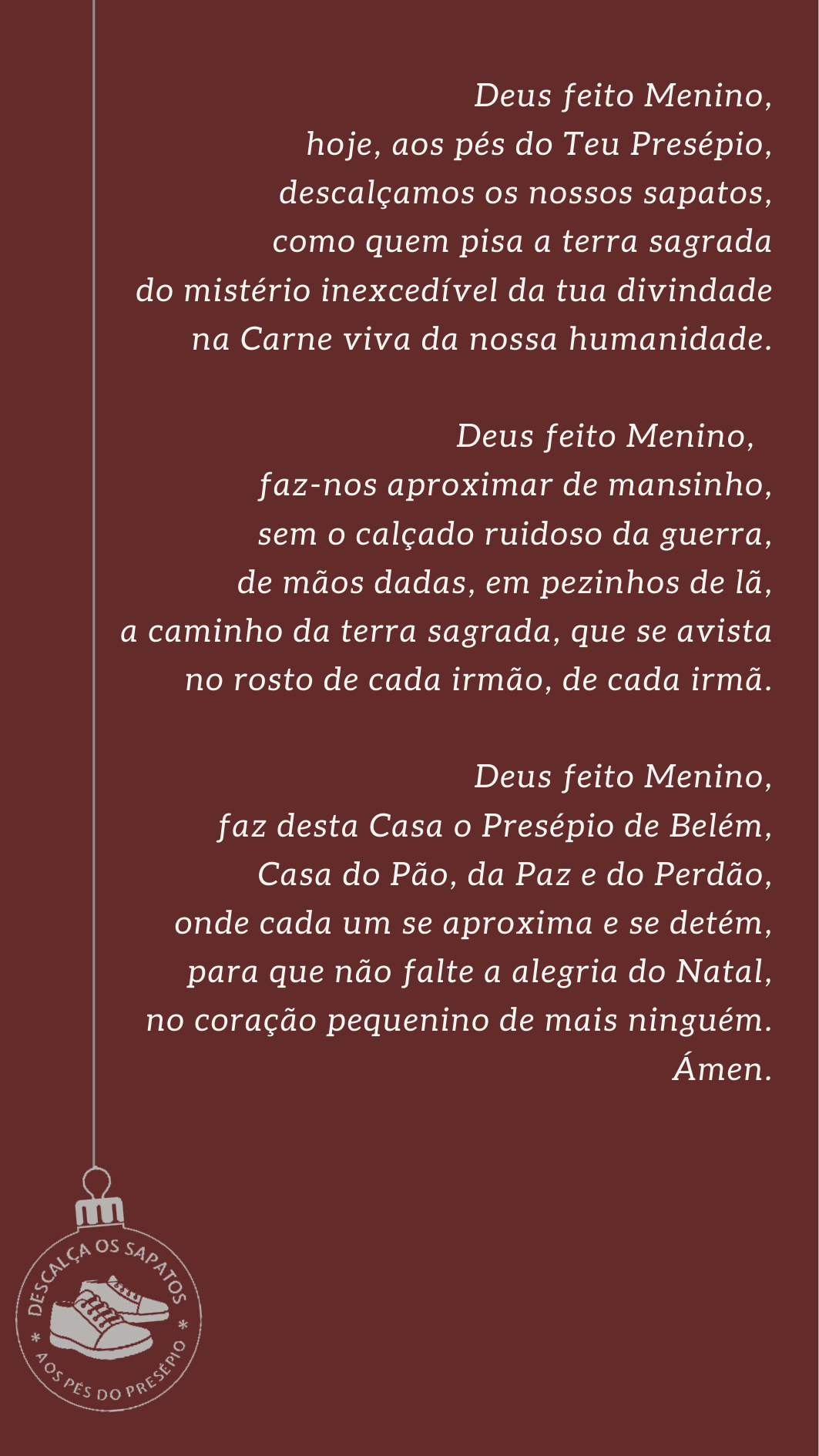 5. Querido irmão, querida irmã: olha que descalço também se caminha (Pe. João Aguiar Campos), seja por dentro do imenso mistério do Natal, seja pela terra sagrada desta humanidade, cujo rosto concreto Deus coloca diante de ti em cada pessoa que te dá como presente! Este é realmente o mistério e a graça desta noite e deste dia: Deus e o Homem caminham, encontram-se e manifestam-se juntos pelo Natal! Por isso, ninguém mais fique para trás ou sozinho. Feliz Natal e pés ao caminho!