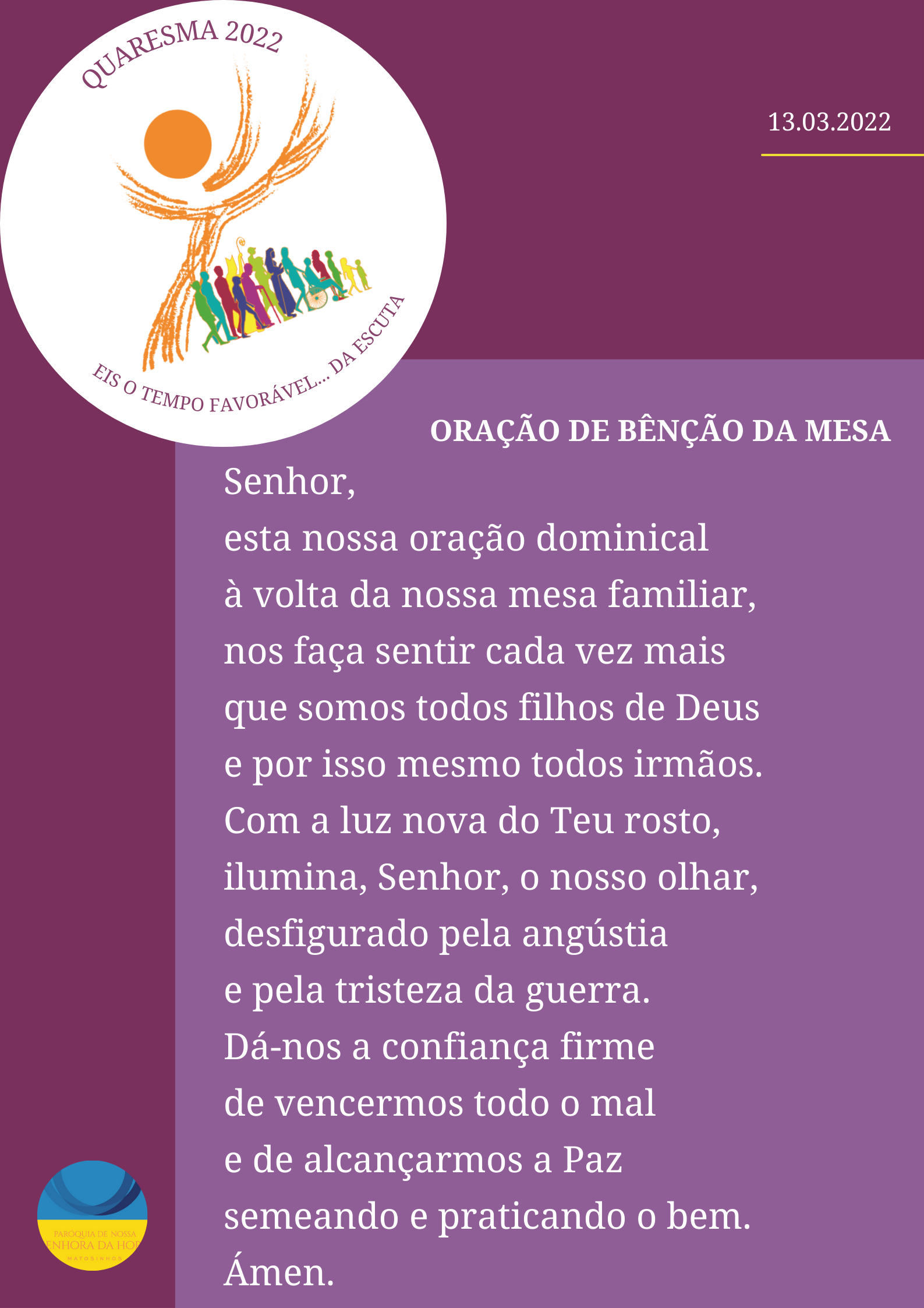 3.4. Rezemos, para transfigurar o nosso olhar, para que o nosso olhar não fique colado ao chão. Não rezemos como se Deus tivesse uma varinha mágica, para bloquear os botões da guerra. Deus está, conhece-nos, acompanha-nos, inspira-nos, anima-nos, mas não nos substitui nesta luta. Rezemos para termos a coragem de enfrentar este combate, de mãos irmanadas, pela vida e pela paz.
