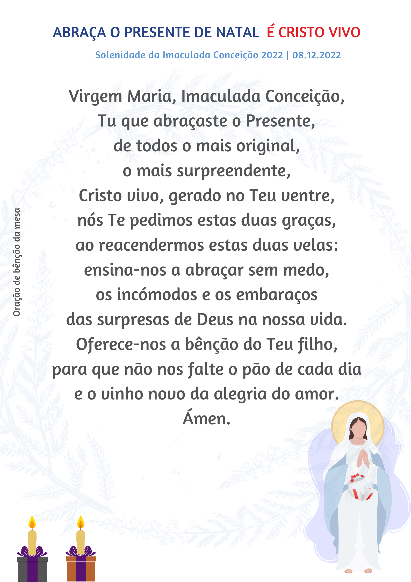 3. Agora, só é preciso que Maria responda e corresponda, acolha e receba de mão beijada a prenda, o Presente, a graça de Deus em carne viva. E Maria diz Sim. Com a força do seu Sim, Maria abraça o presente, sem rodeios, sem reservas, sem condições, sem esperar para ver que acontece. Apesar do embaraço daquele abraço, Maria – literalmente embarazada, como se diz na língua espanhola para falar de uma mulher grávida – arriscou tudo. Maria teria, sem dúvida, uma missão difícil pela frente, mas as dificuldades não foram razão para Ela dizer não. Certamente tinha complicações, mas não aquelas que resultam da cobardia que nos paralisa por não ver tudo claramente ou por não ter tudo assegurado de antemão. Maria abraçou o presente; não comprou um seguro de vida. O sim e a vontade de servir foram mais fortes do que as dúvidas e dificuldades (cf. Ch.viit, n.º 44). E graças àquele Sim, Maria abraçou o mais original presente de Natal.
