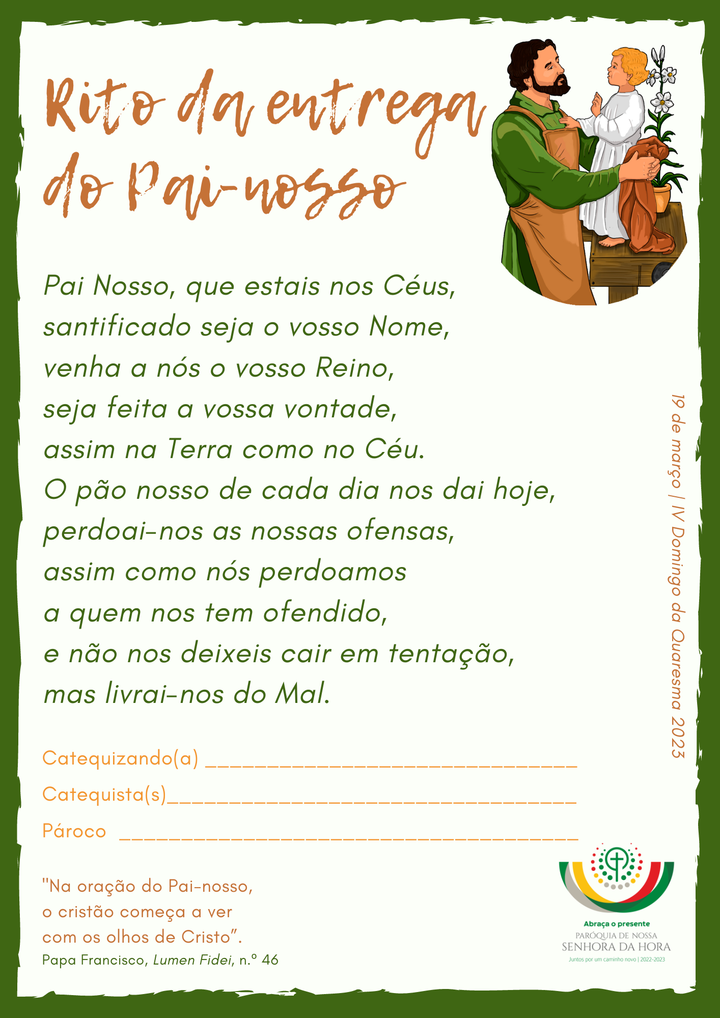 Que esta figura luminosa do pai não se apague, na família, na sociedade, na Igreja. Precisamos da sua luz e da sua sombra. Porque a sombra só existe quando brilha a Luz. Que a sombra do pai de cada um de nós nos guie e nos acompanhe na direção da Luz de Deus, Único Pai, o Pai de todos, o Pai que está nos céus (Mt 23, 9)!