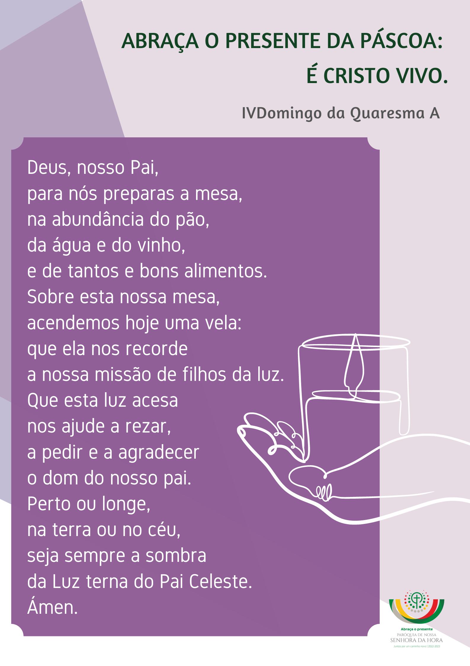 1. Este IV Domingo da Quaresma, vestido de cor-de-rosa, traz-nos um cheirinho à alegria da Páscoa, como a promessa de uma Primavera que já se anuncia. É verdade que nos ensombra ainda um inverno duro e escuro, por tantas coisas, “que devem ser condenadas abertamente”, “coisas feitas em segredo, que até vergonhoso dizê-lo” (Ef 5,11.12). Mas é também graças a esta mesma Luz, da bondade, da justiça e da verdade (Ef 5,9), que tantas coisas são postas a descoberto! A Liturgia deste Domingo quer-nos dar um banho de luz, pondo-nos de frente a Jesus, Luz do mundo. Neste banho de luz, tornamo-nos filhos da luz. Agora, podemos ver Jesus e ver tudo com os olhos de Jesus (cf. LF 46)!