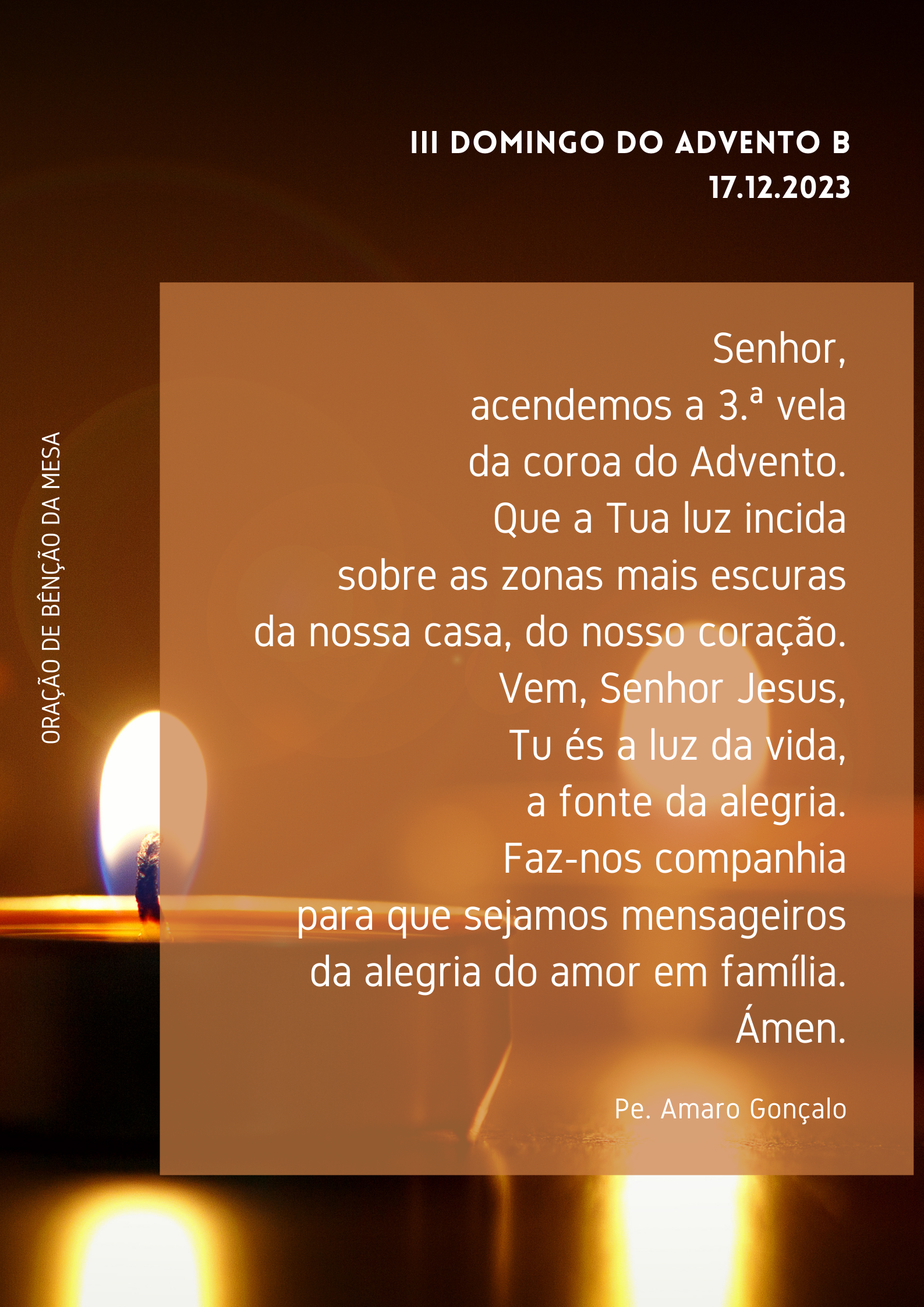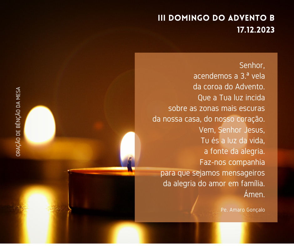 Vamos com alegria. Vamos todos a Belém”. Com este propósito, continuamos, com alegria, a percorrer o caminho desde o Advento até à Festa do Batismo do Senhor. Ao caminharmos, a passos largos para Belém, ao sentir já a intensidade e a proximidade da Luz do Natal, o nosso coração exulta de alegria no Senhor. A cor roxa abre-se ao cor-de-rosa, neste domingo, que nos reveste da alegria da salvação. Neste início da terceira semana do advento, o nosso propósito é viver a Alegria do Evangelho e a doce e reconfortante alegria de evangelizar.