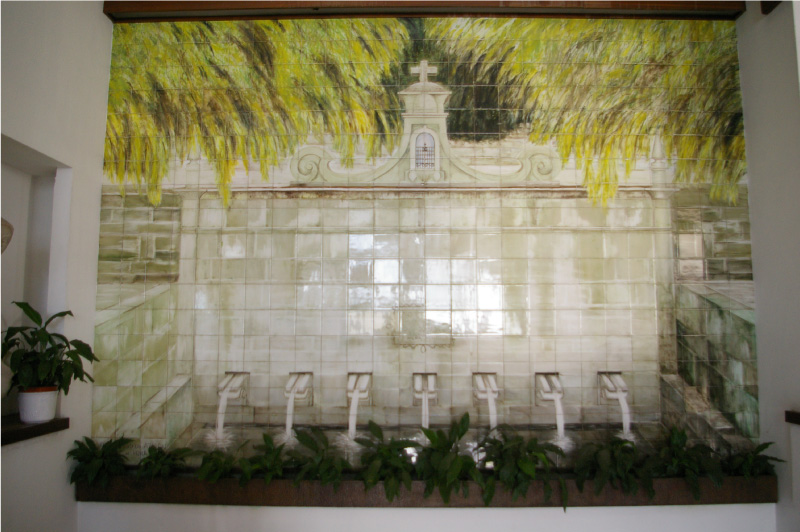 A primitiva Fonte das Sete Bicas, anterior à capela de Nossa Senhora da Hora, encontrava-se ao centro do adro, em frente à referida capela. Em 7 de agosto de 1892, em Assembleia Geral [da Irmandade de Nossa Senhora da Hora e São Bartolomeu] estudou-se a forma de se efetuarem futuras obras. (…) Era imperiosa a mudança da Fonte das Sete Bicas, situadas no centro do adro, encostadas à parede que separava o adro do terreno da Irmandade de Nossa Senhora da Hora, para outro local, na direção Este-Oeste (…) Embora o orçamento para a obra não tivesse sido aprovado superiormente, procedeu-se à sua arrematação e caso não fosse aprovada ficaria sem efeito. Foi pouco tempo depois arrematada pelo único empreiteiro que apresentou proposta, Manuel Francisco Gomes que se comprometia a construir a obra, conforme a planta, em condições, pela quantia de 83$000 réis ao mesmo tempo que apresentou 10$00 de depósito, como garantia, que só receberia dois meses depois da obra concluída.