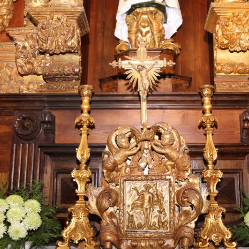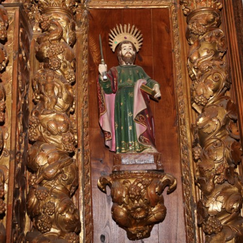A seus pés, na pianha em que assenta, encontram-se dois anjos. No seu lado direito, em lugar de honra, encontra-se S. Bartolomeu, à esquerda São José.
